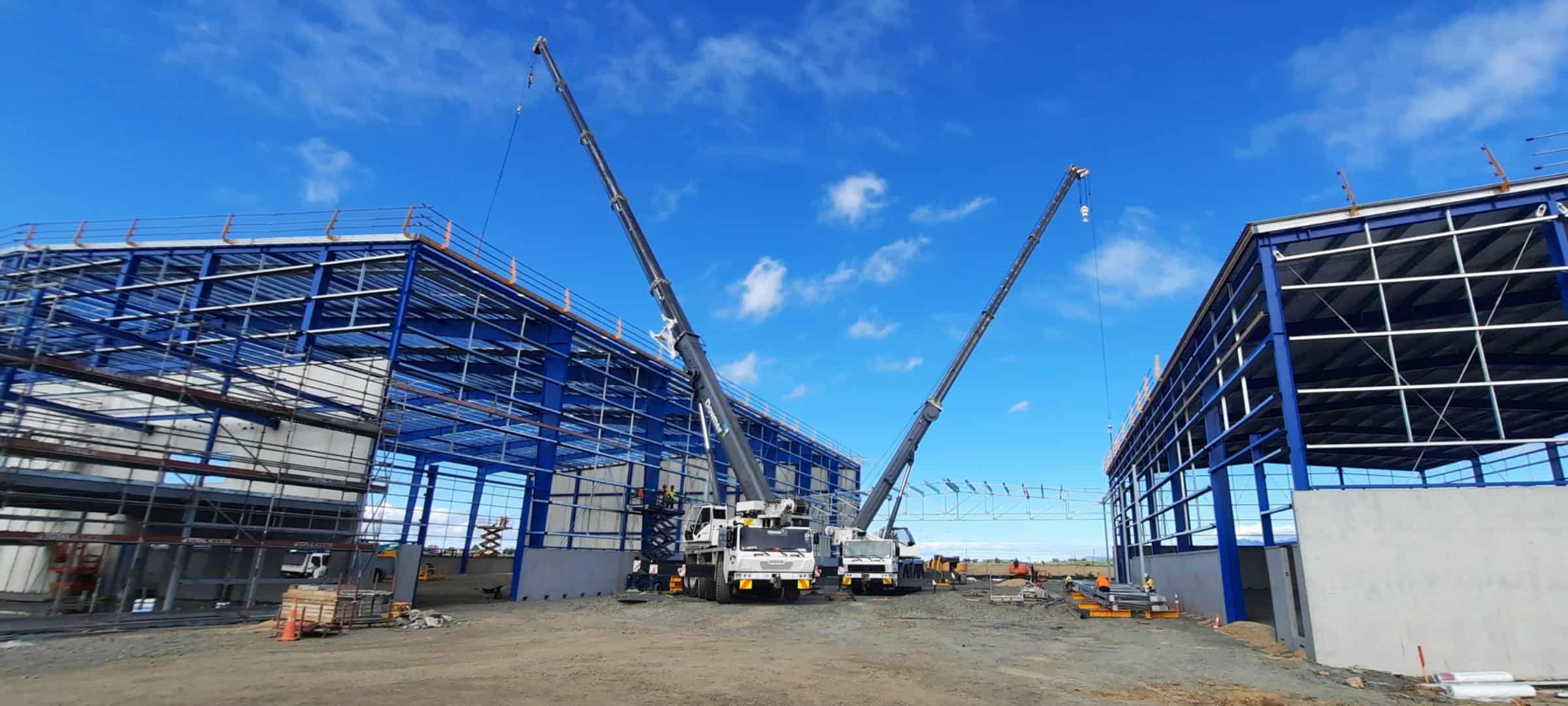 Grove 130tonne and 50tonne cranes lifting roofing sheeting on site in Hamilton