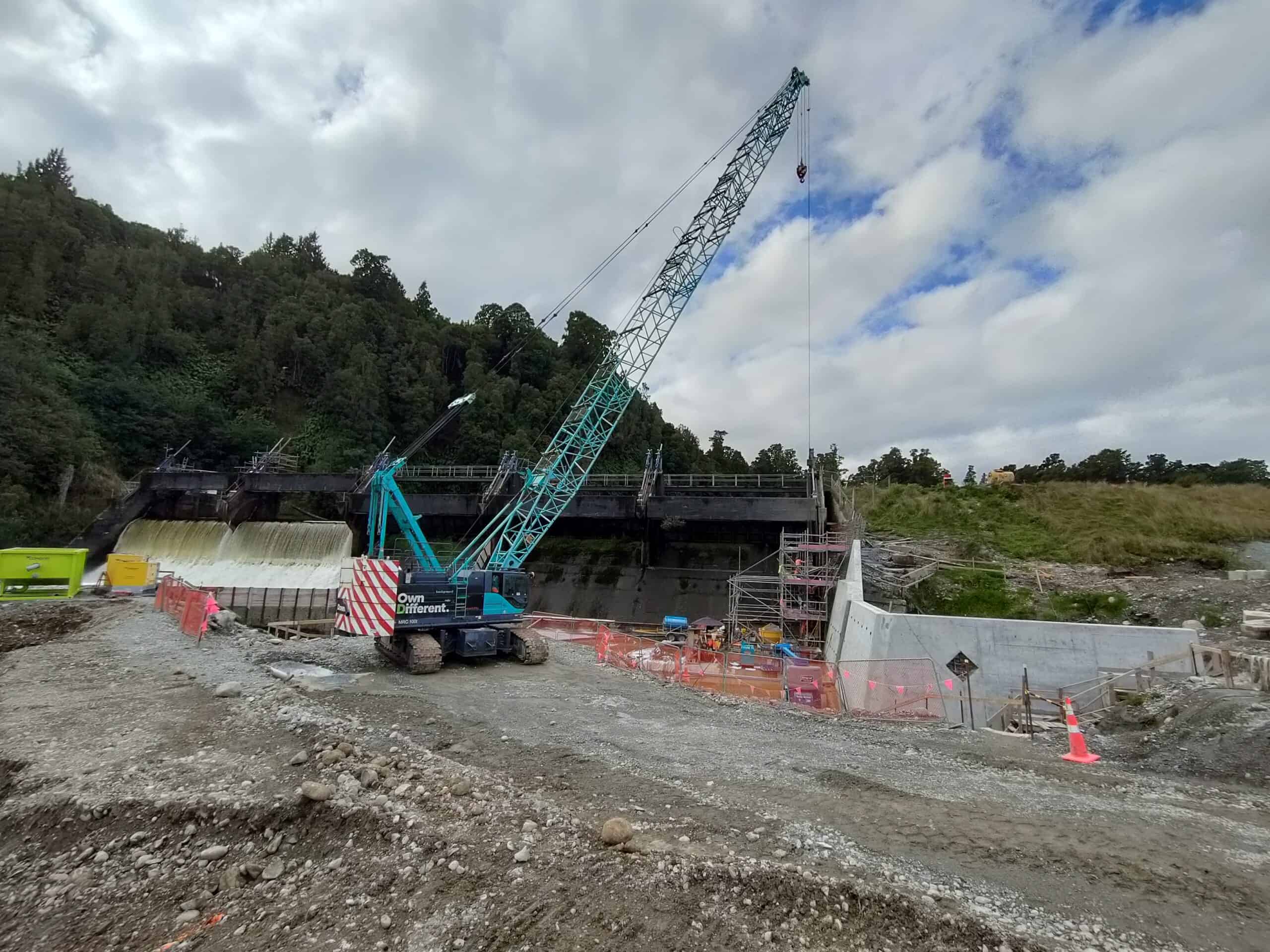 Kobelco 100tonne Crawler Crane assisting with hydro dam upgrades at Arnold River Dam.