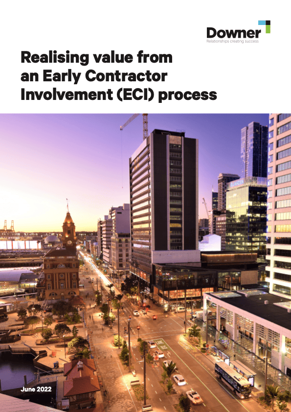 Early Contractor Involvement (ECI) helps navigate complex projects and mitigates the pressures and risks associated with delivering successful outcomes, and is complementary to both traditional and novated design and build project models. Over the last 10 years, Downer New Zealand has completed over 30 ECIs in various forms and with wide-ranging implementation processes. This whitepaper from Bruce Cullen, General Manager for Business Support and Performance shares our perspective on ECIs, their potential benefits, and what best practice looks like.