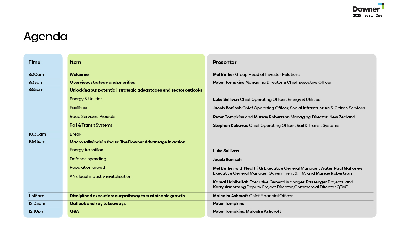 Downer Group held its 2025 Investor Day on Thursday 27 November, during which our Executive Leadership Team presented the organisation's outlook, strategic priorities, and growth potential.